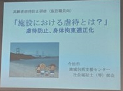 第1部の講義では、虐待に関する基礎知識の復習や具体的な事例、今治市内での現状、不適切なケア(いわゆるグレーゾーン)について学びました。