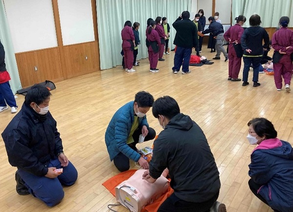 講義では、救命活動の現状や救命率を高めるために重要なポイントについて学び、その後、班に分かれて実技研修を行いました。